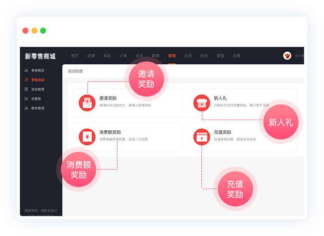 邀请奖励,新人礼,消费奖励,充值奖励,满足商城不同运营需求,助力商城拉新、促活、消费、留存、充值。